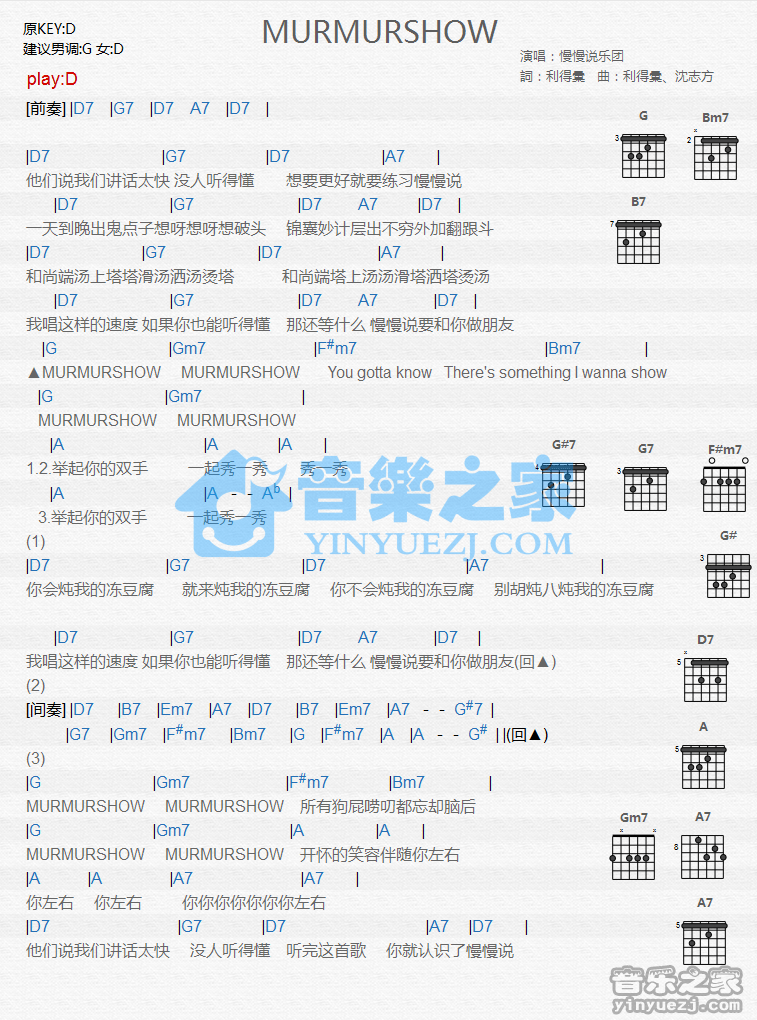 D调版杭士琁《Murmurshow》吉他和弦弹唱谱...