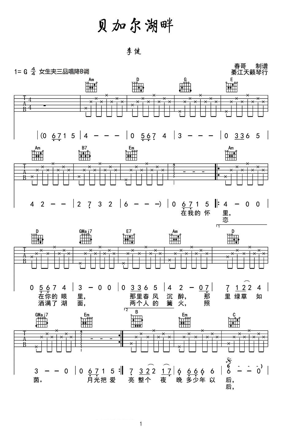 吉他李健《贝加尔湖畔》吉他谱_吉他弹唱谱_春哥编配