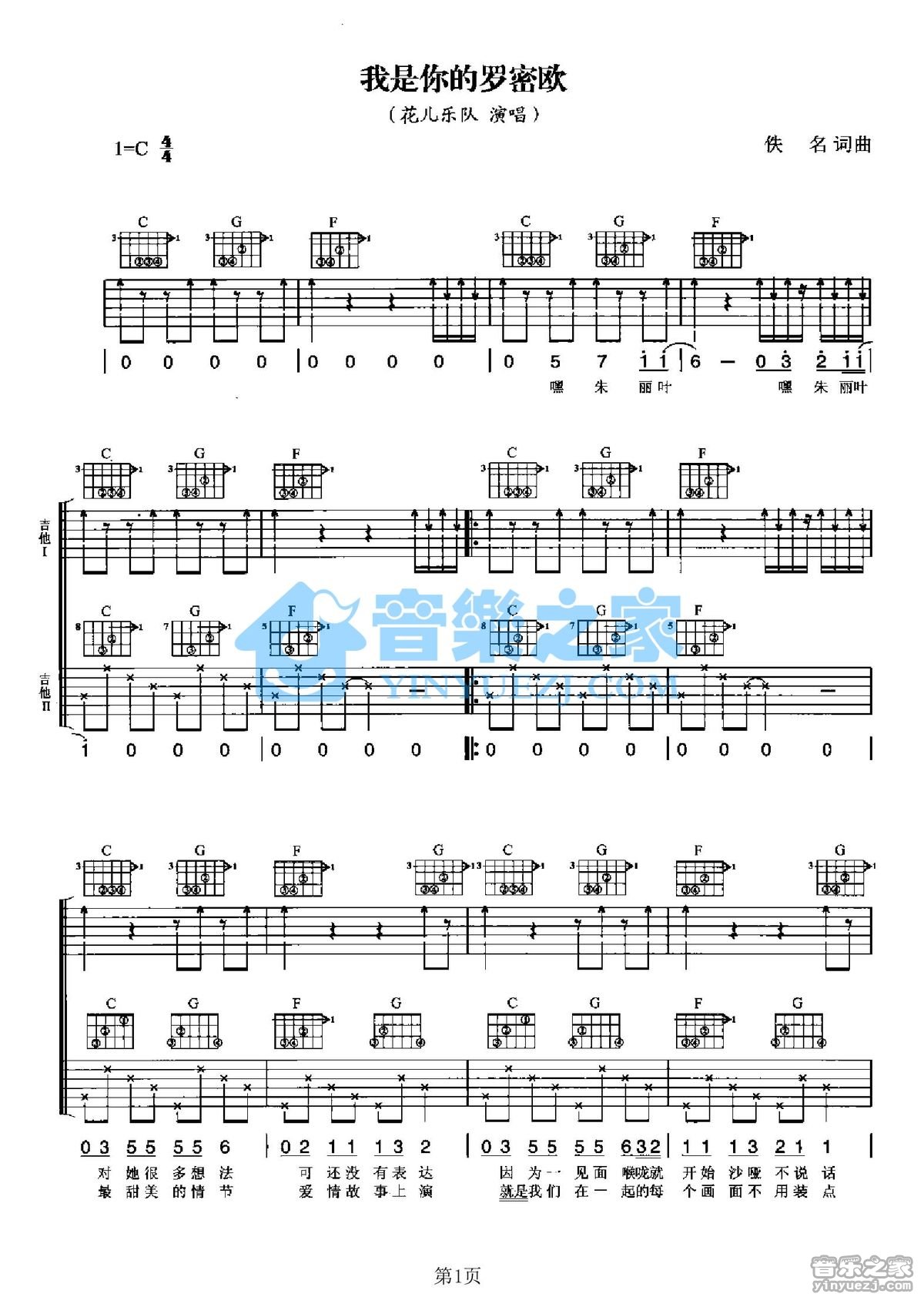 C调双吉他版花儿乐队《我是你的罗密欧》吉他弹唱六线谱...