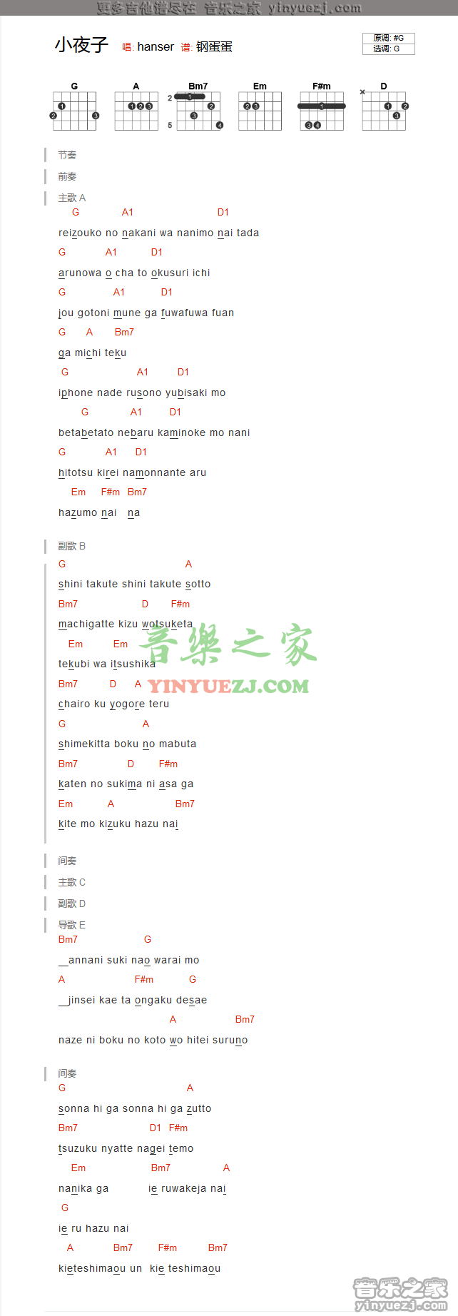 吉他hanser《小夜子》吉他谱_吉他弹唱谱_YYZJ编配