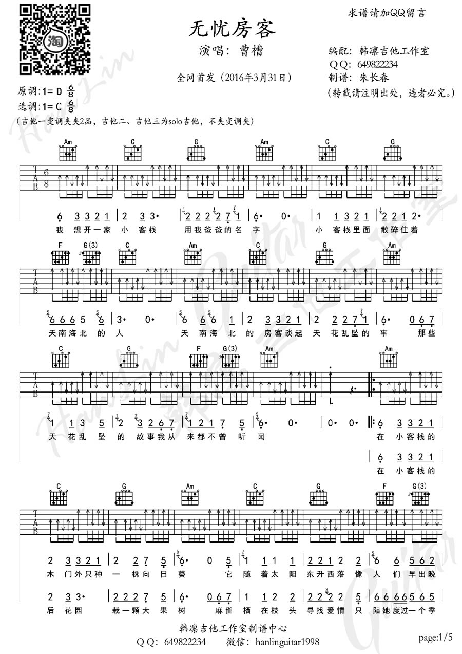 吉他曹槽《无忧房客》吉他谱_吉他弹唱谱_韩凛吉他工作室--朱长春编配