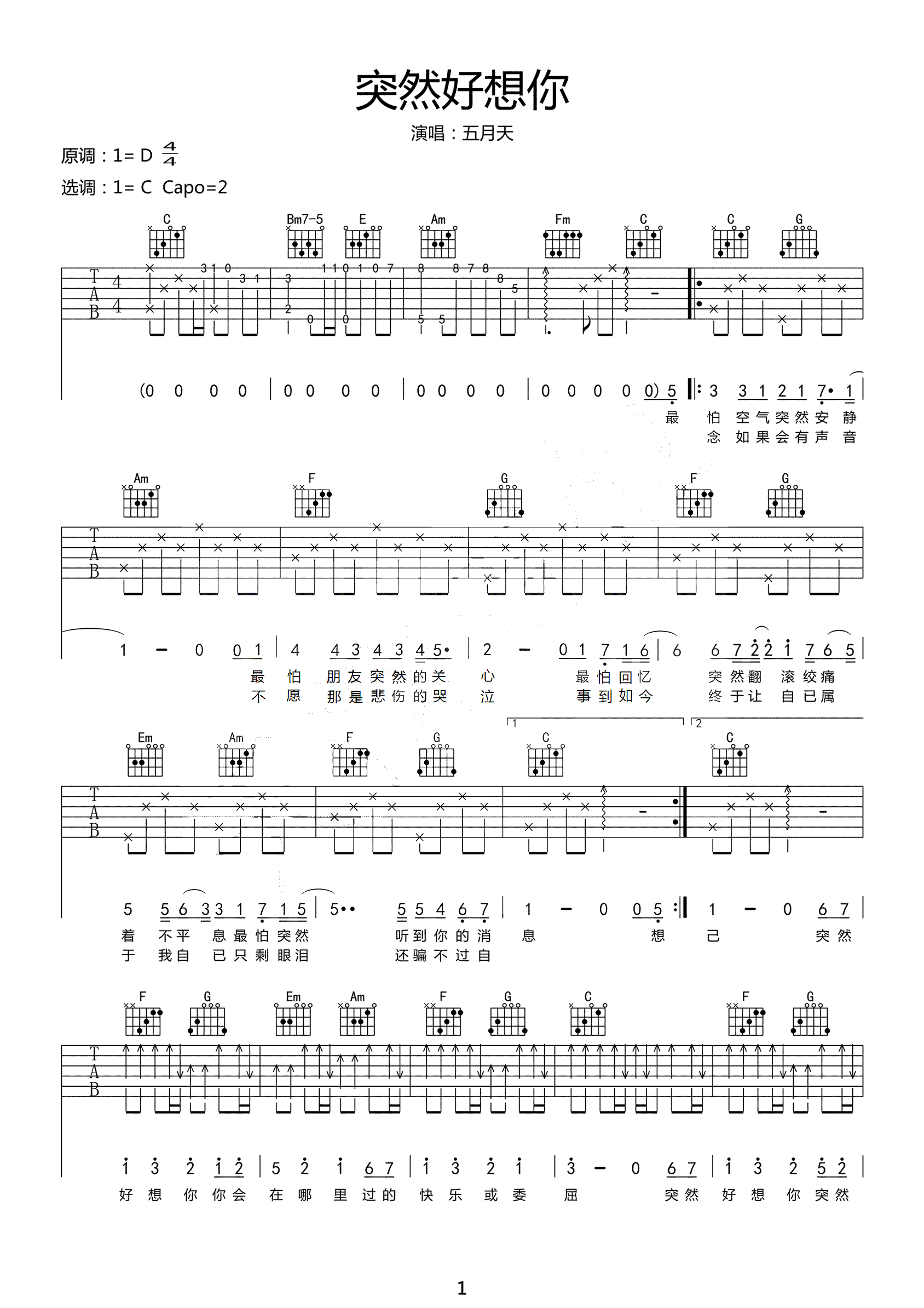 吉他五月天《突然好想你》吉他谱_吉他弹唱谱_天韵吉他编配