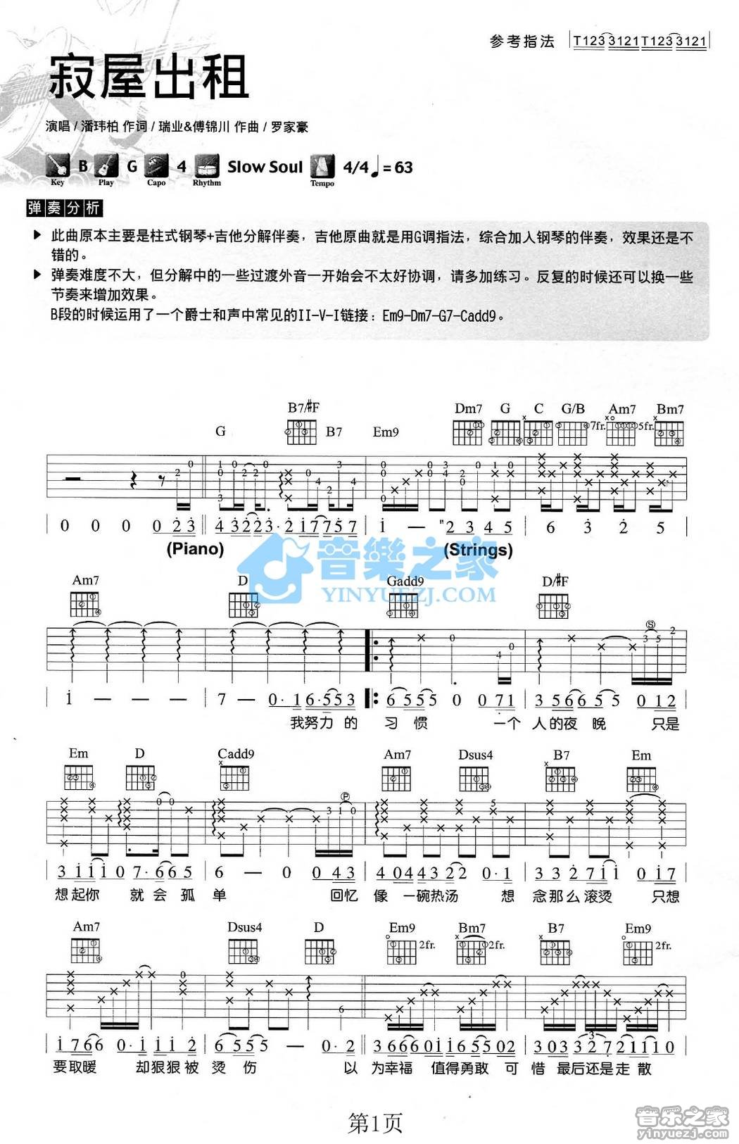 G调版潘玮柏《寂屋出租》吉他弹唱六线谱...