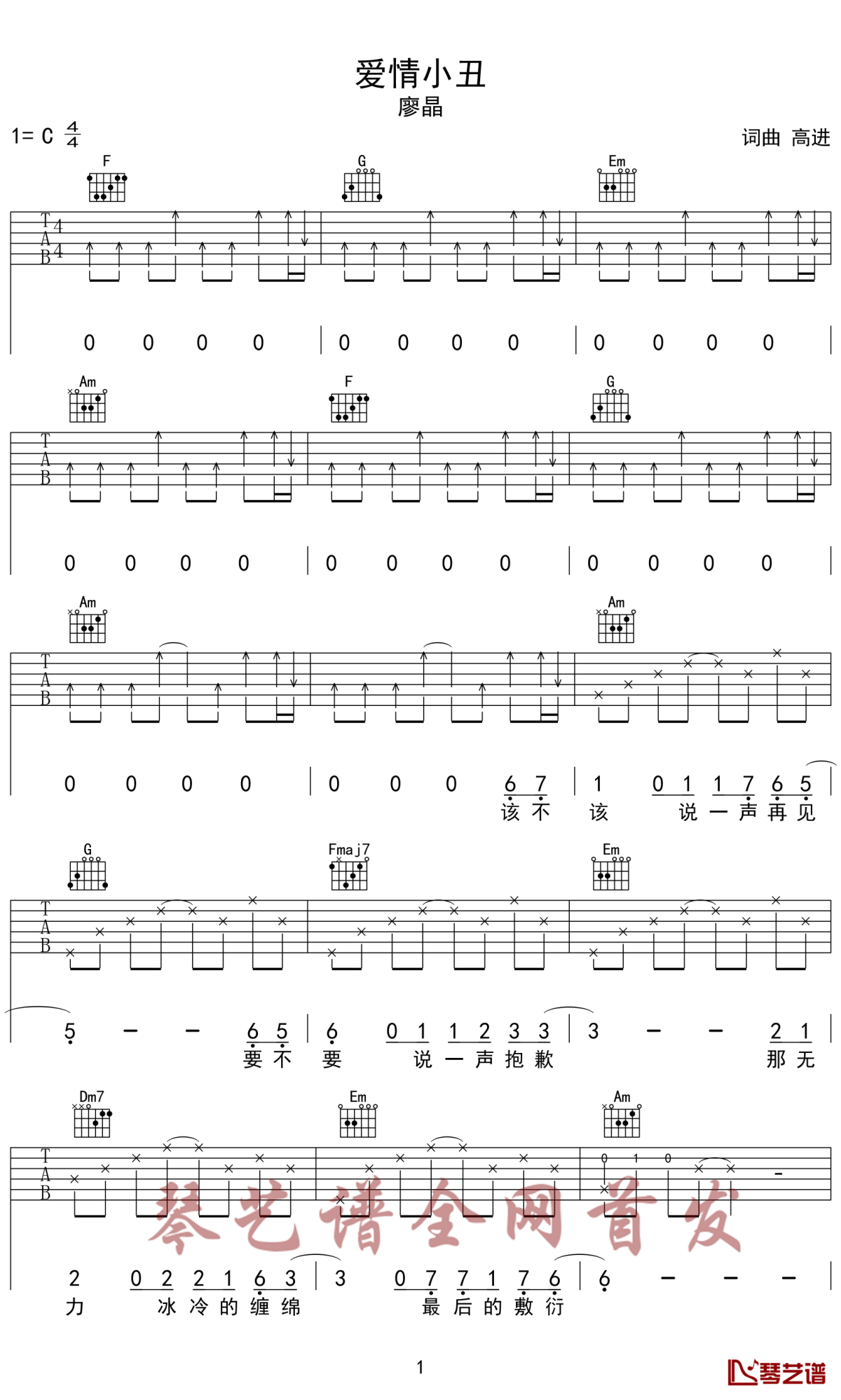 廖晶《爱情小丑》吉他谱_C调吉他弹唱谱...