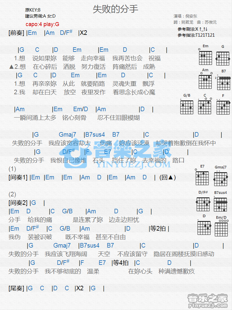 吉他倪安东《失败的分手》吉他谱_吉他弹唱谱_YYZJ编配