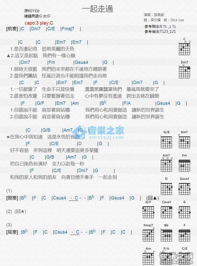 C调版孙燕姿《一起走过》吉他和弦弹唱谱...