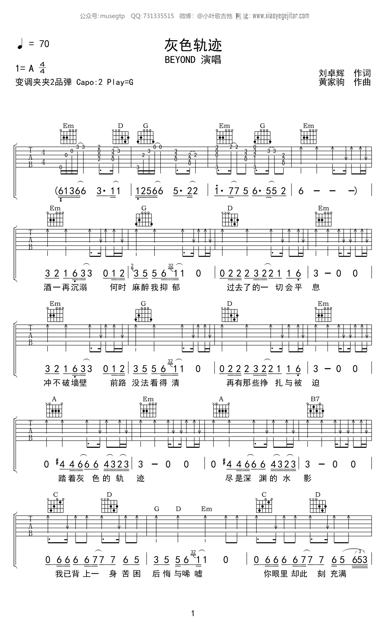 吉他beyond《灰色轨迹》吉他谱_吉他弹唱谱_小叶歌编配