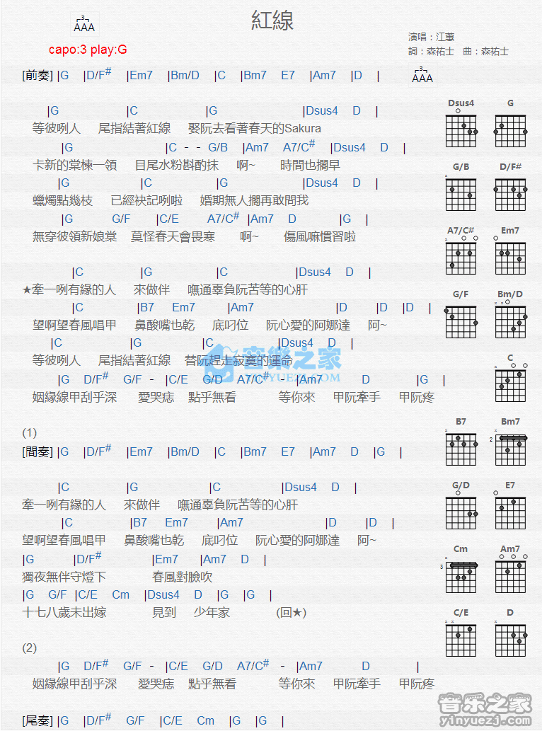 吉他江蕙《红线》吉他谱_吉他弹唱谱_YYZJ编配