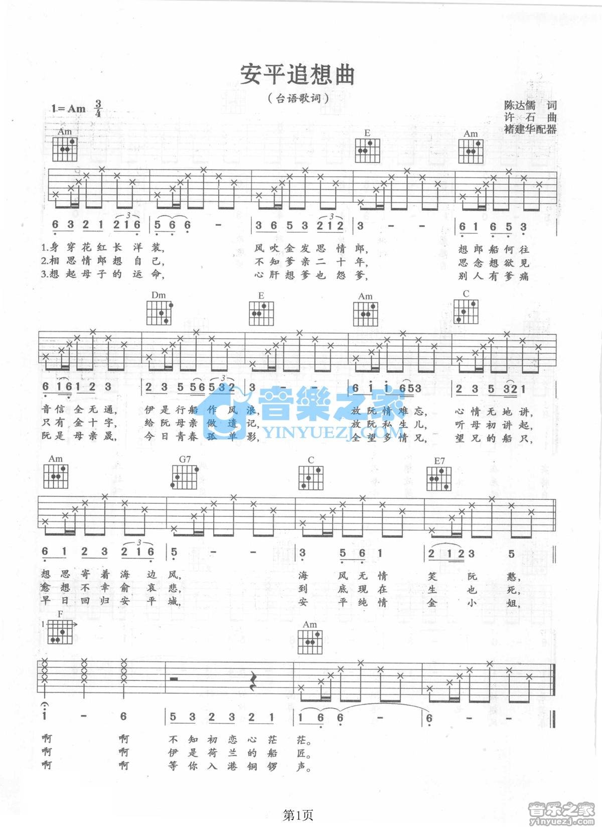 Am调版台语歌曲《安平追想曲》吉他弹唱六线谱...
