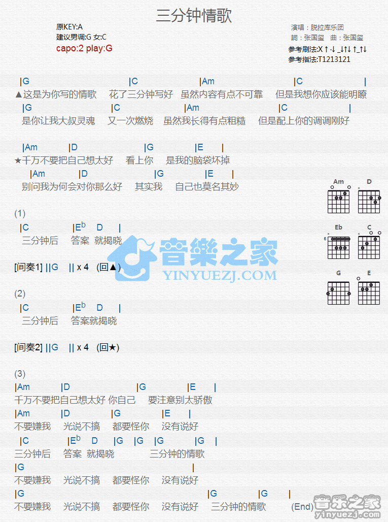 吉他脱拉库《三分钟情歌》吉他谱_吉他弹唱谱