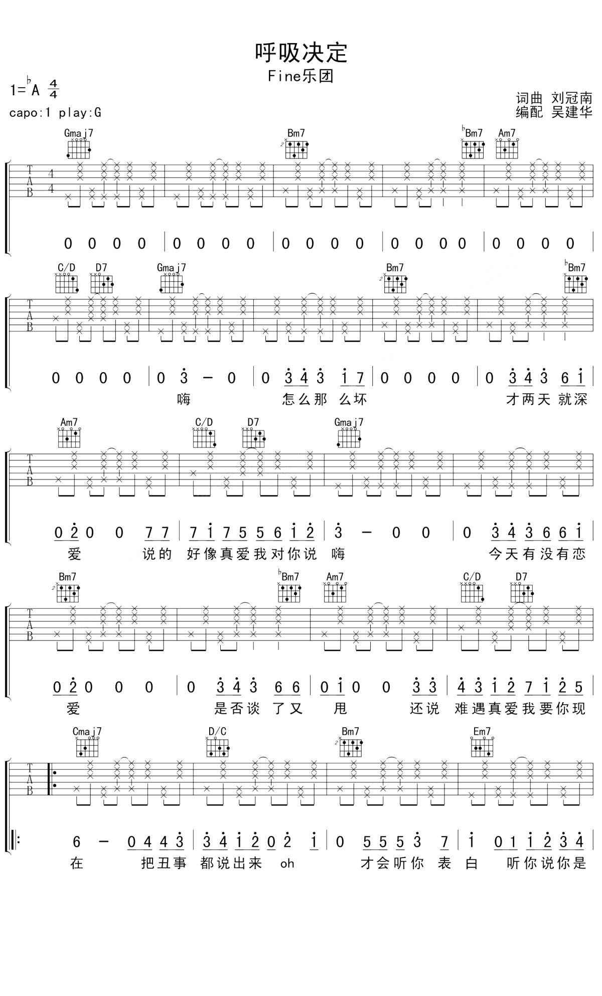 吉他Fine乐团《呼吸决定》吉他谱_吉他弹唱谱_吴建华编配