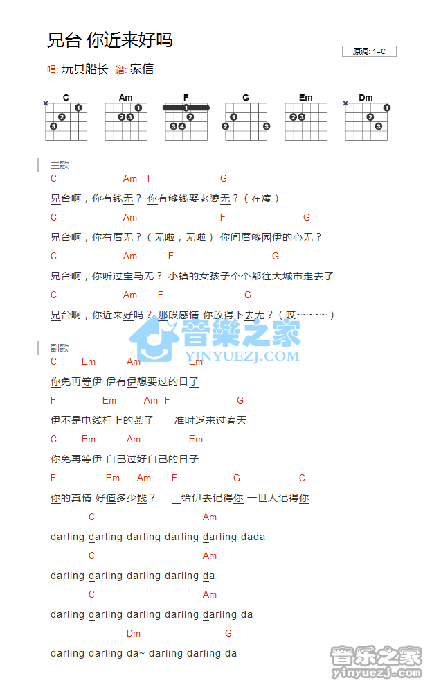 C调版玩具船长《兄台你近来好吗》吉他和弦弹唱谱...