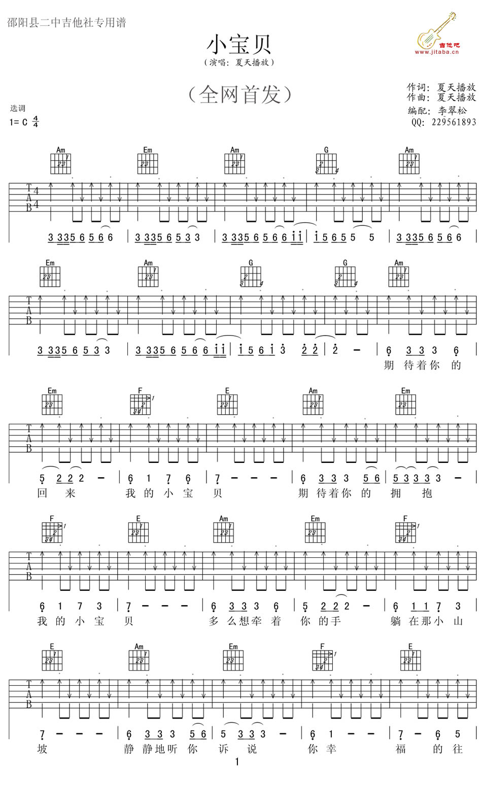 吉他夏天播放《小宝贝》吉他谱_吉他弹唱谱_李翠松编配