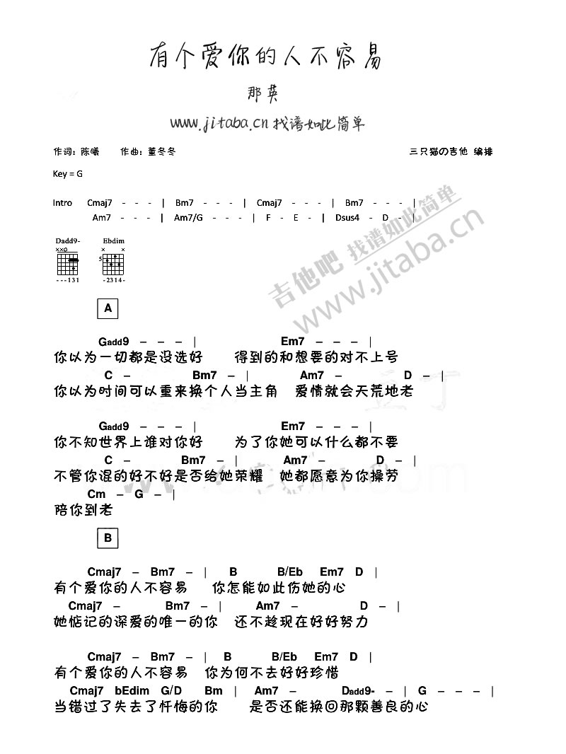吉他那英《有个爱你的人不容易》吉他谱_吉他弹唱谱_三只猫的吉他编配