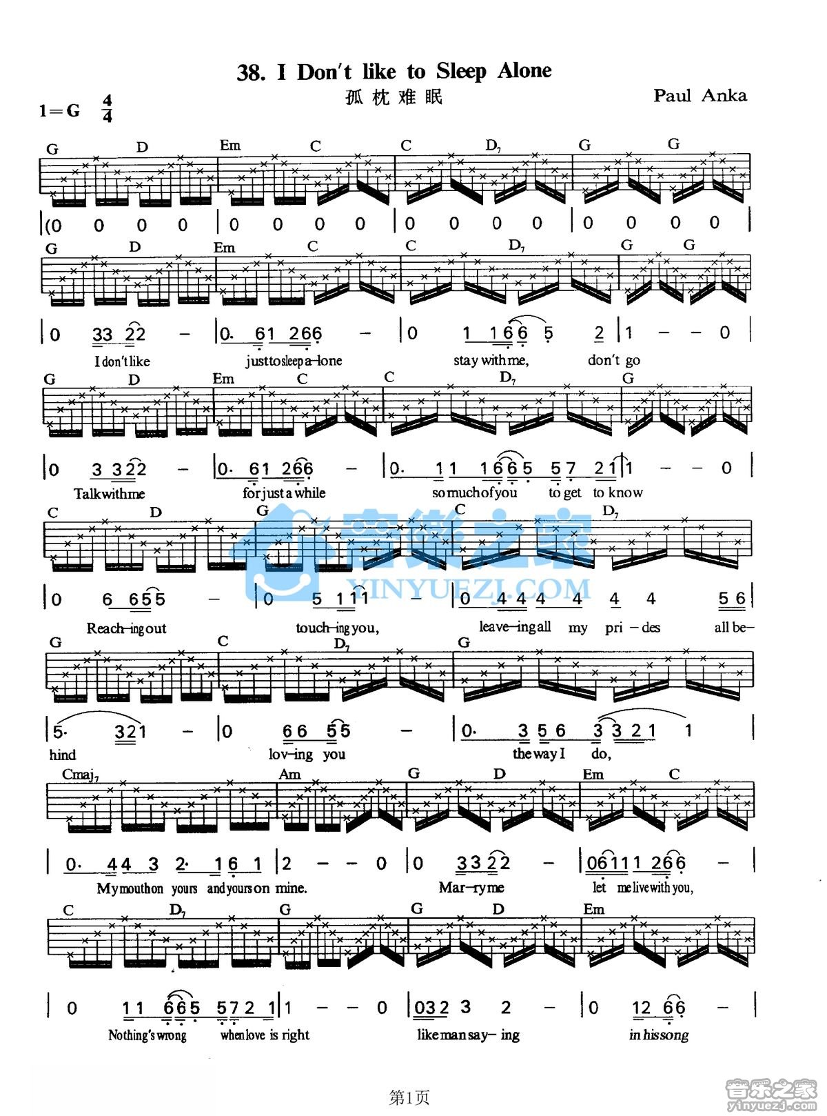 吉他《I Dont Like To Sleep Alone》吉他谱_吉他弹唱谱_YYZJ编配