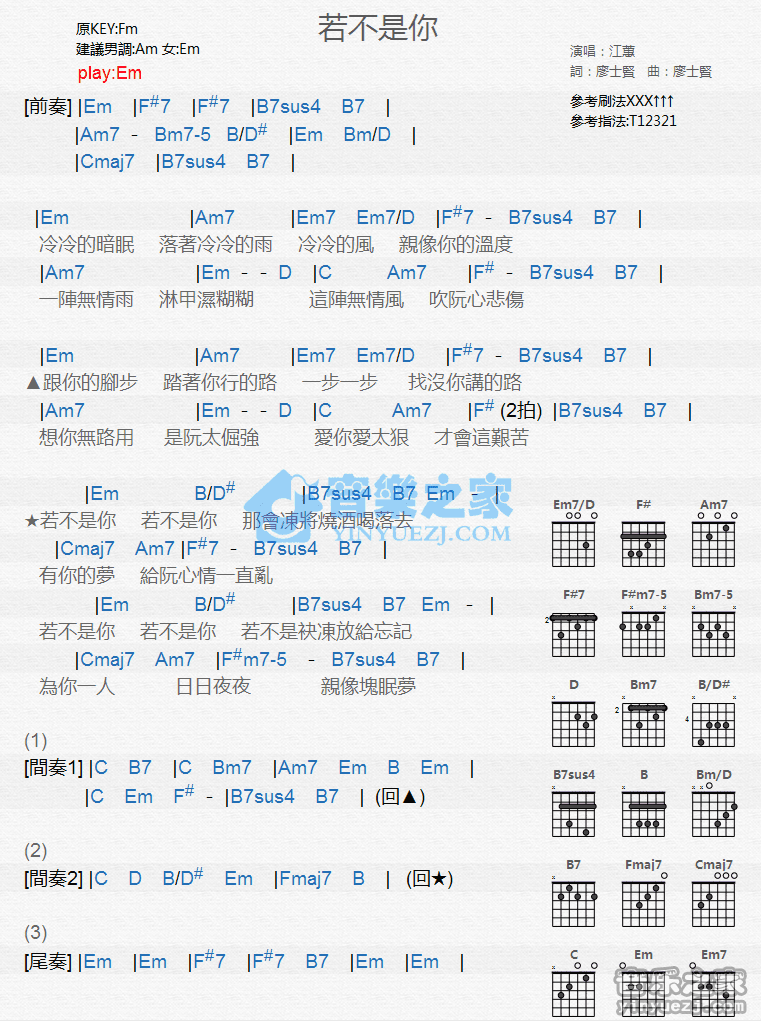 Em调版江蕙《若不是你》吉他和弦弹唱谱...