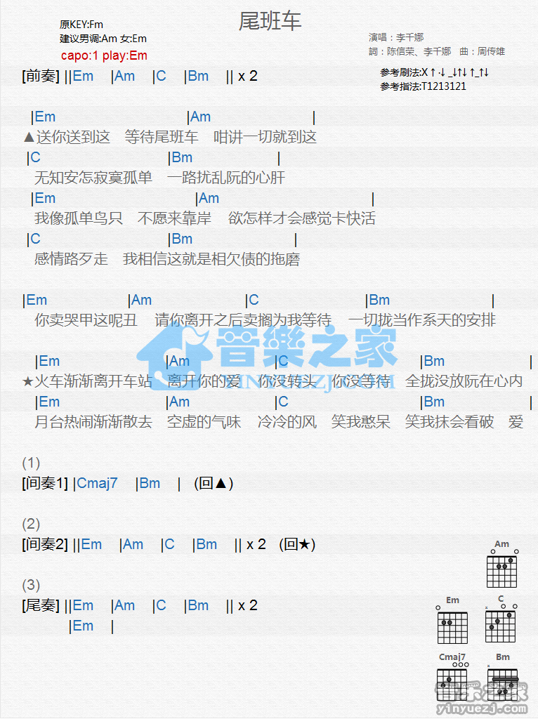 Em调版李千娜《尾班车》吉他和弦弹唱谱...