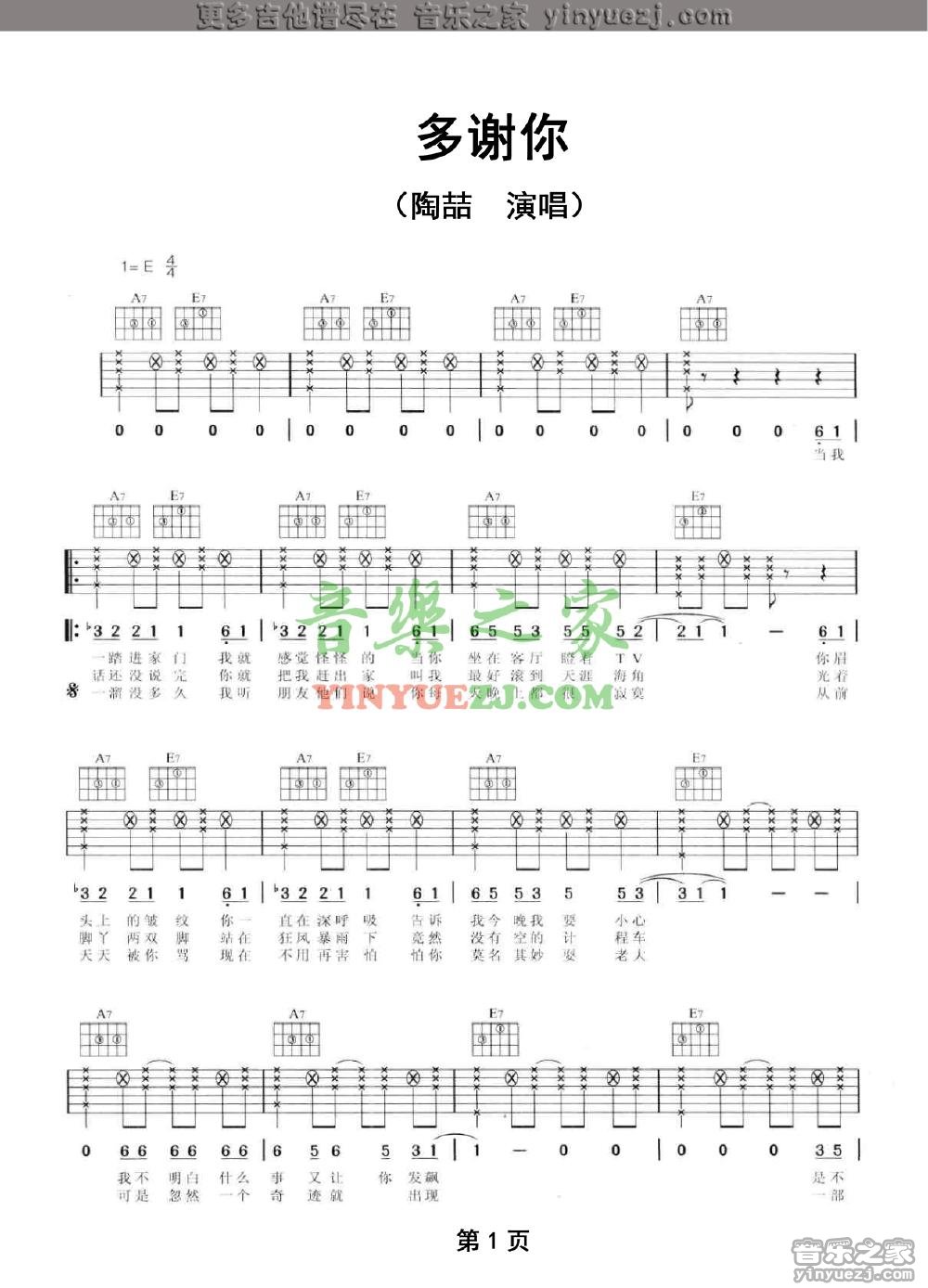 陶喆《多谢你》吉他谱,YYZJ编配出品,共有2张高清图谱,免翻页排版设计。...