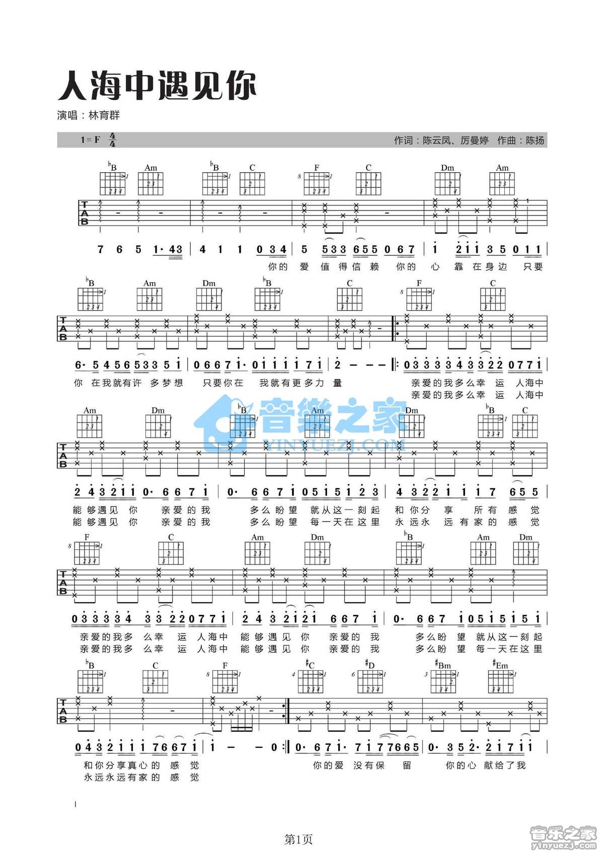 吉他林育群《人海中遇见你》吉他谱_吉他弹唱谱_YYZJ编配