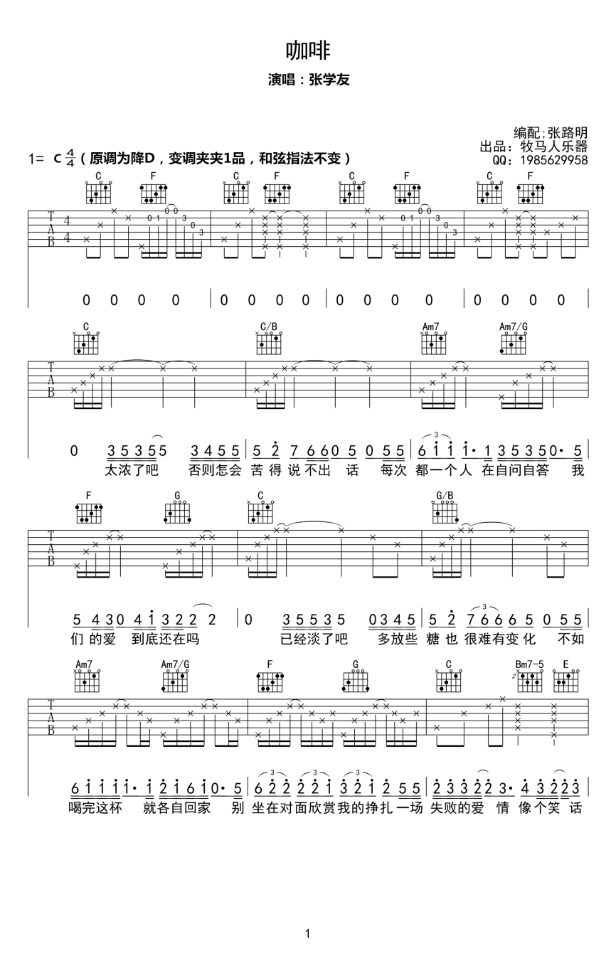 吉他张学友《咖啡》吉他谱_吉他弹唱谱_牧马人乐器--张路明编配