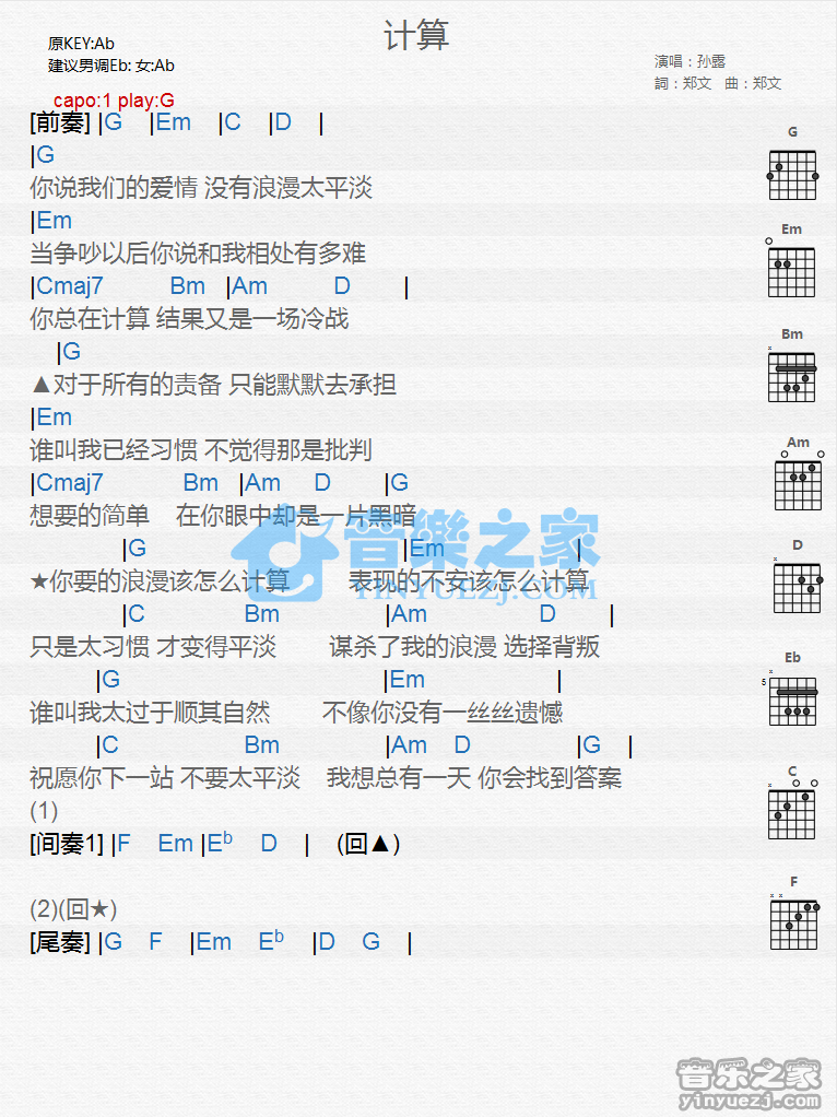 吉他孙露《计算》吉他谱_吉他弹唱谱_YYZJ编配