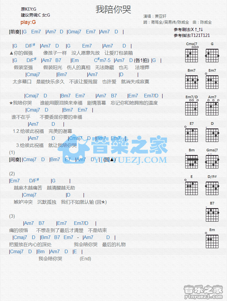G调版萧亚轩《我陪你哭》吉他和弦弹唱谱...