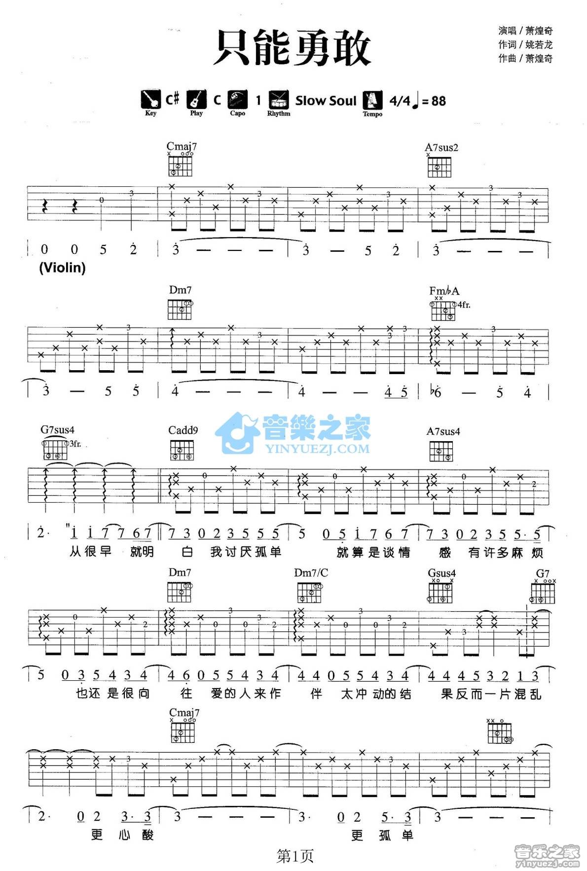 吉他萧煌奇《只能勇敢》吉他谱_吉他弹唱谱_YYZJ编配
