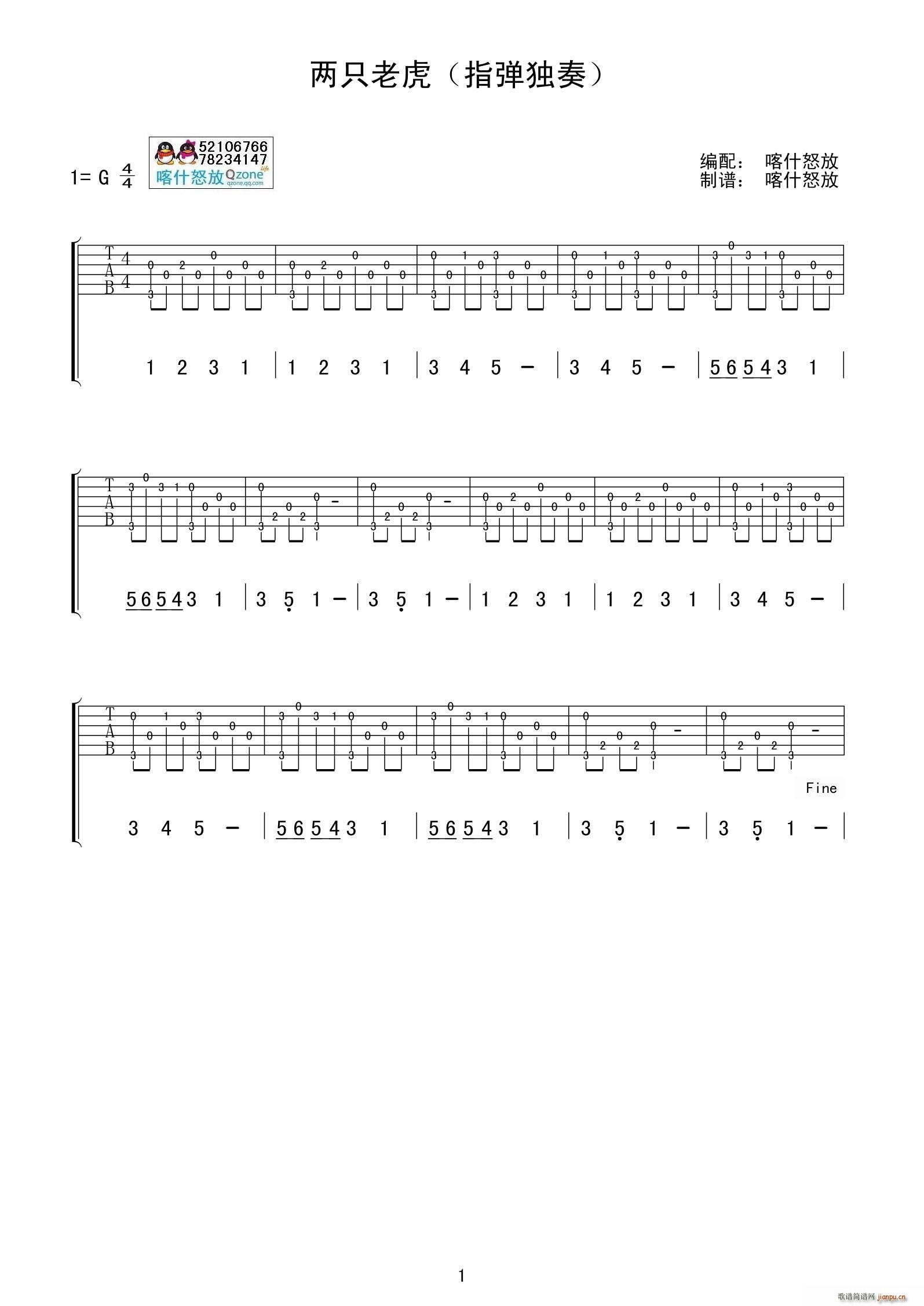 儿歌《二只老虎》吉他谱_G调吉他独奏谱...