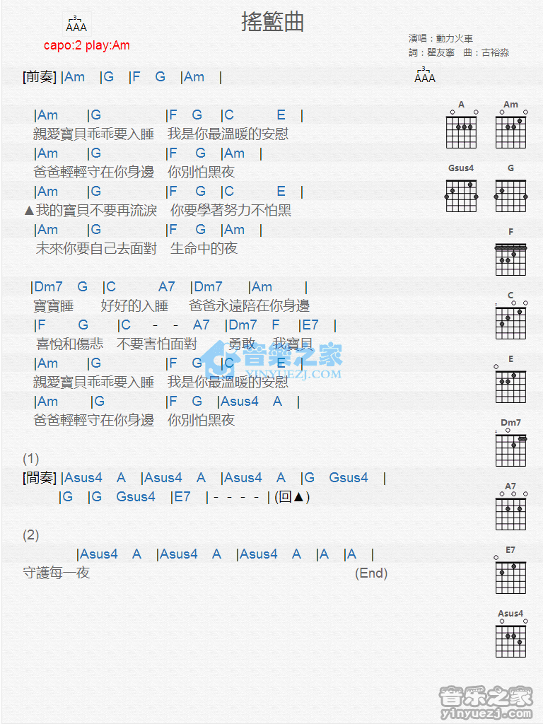 吉他动力火车《摇篮曲》吉他谱_吉他弹唱谱_YYZJ编配