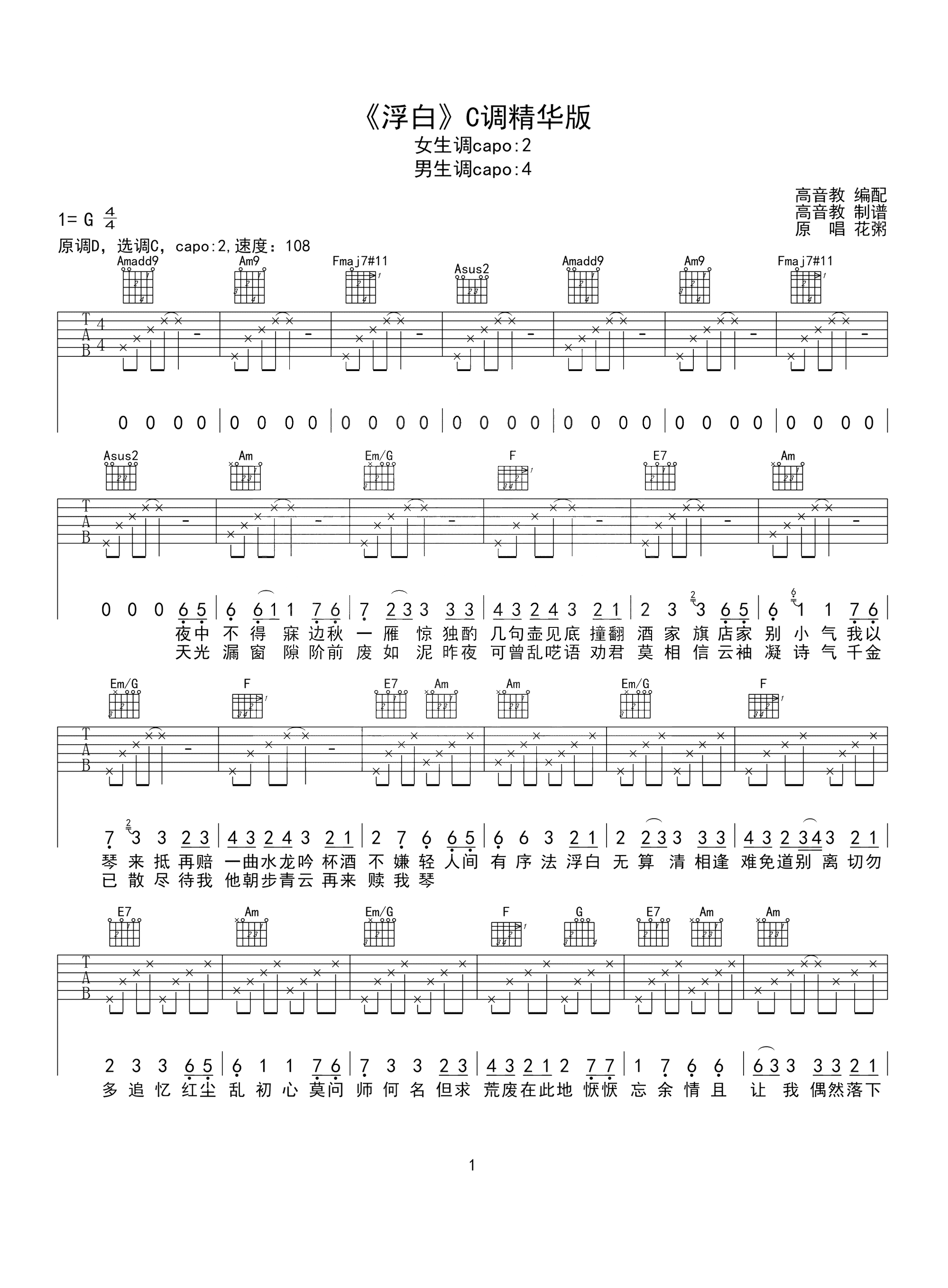吉他花粥/王胜男《浮白》吉他谱_吉他弹唱谱_高音教编配