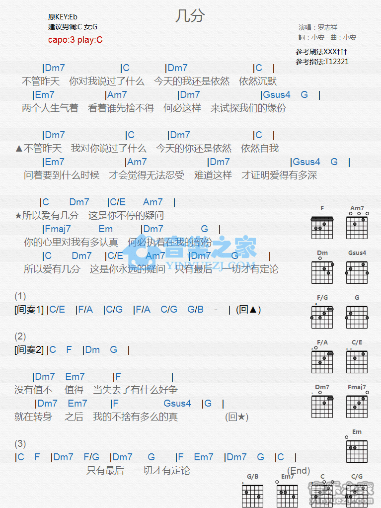 C调版罗志祥《几分》吉他和弦弹唱谱...