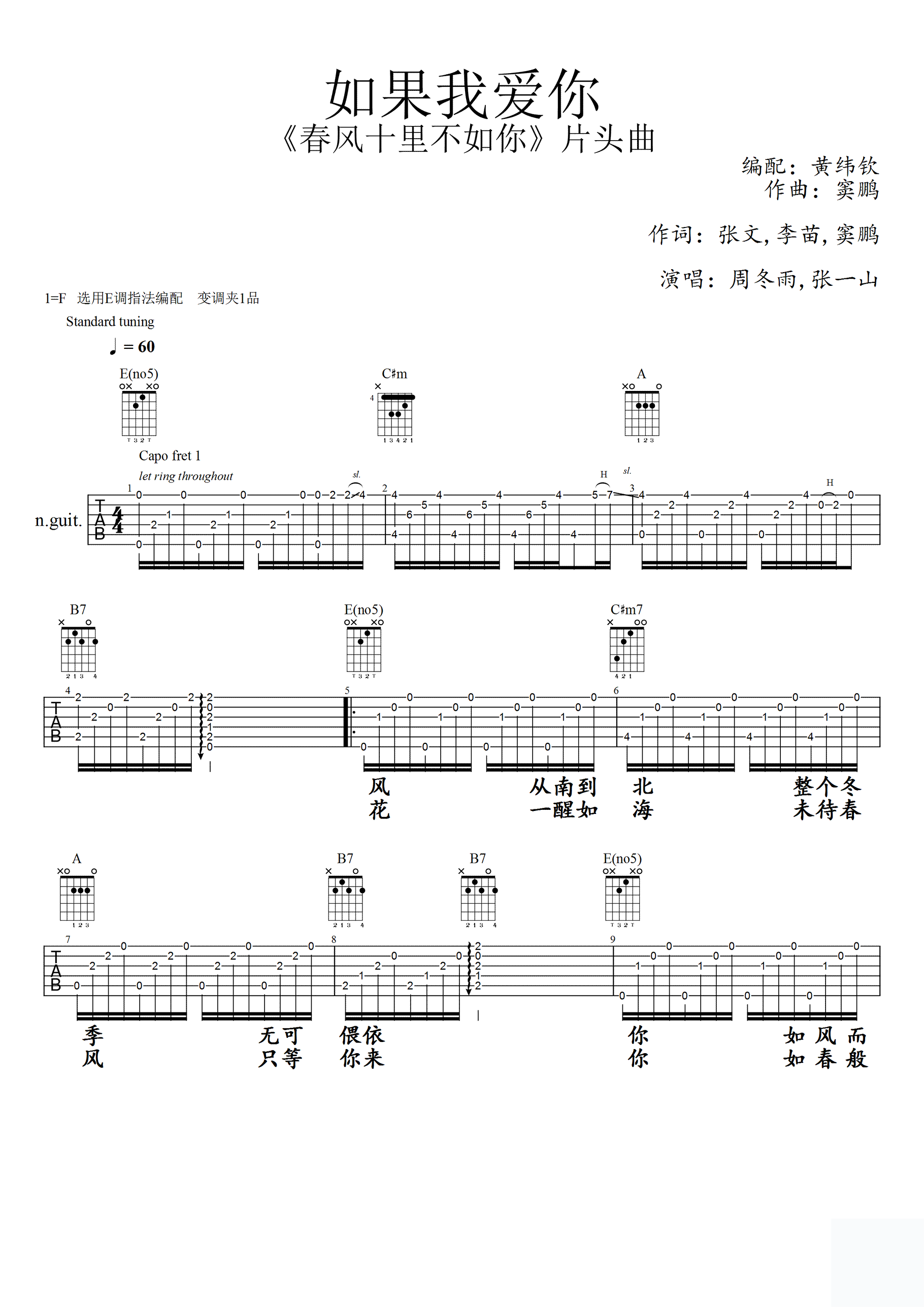 张一山周冬雨《如果我爱你》吉他谱,网络热门电视剧《春风十里不如你》主题曲,如果我爱你六线谱,原调F,选用E调指法,变调夹夹第一品。一首好听的男女对唱歌曲,唱出剧中人对于爱情的内心独白。青春难免会遇秋水,但也庆幸能够遇见他,然后选择离开他,愿现实生活里可爱的人,多些好不容易,少些爱...