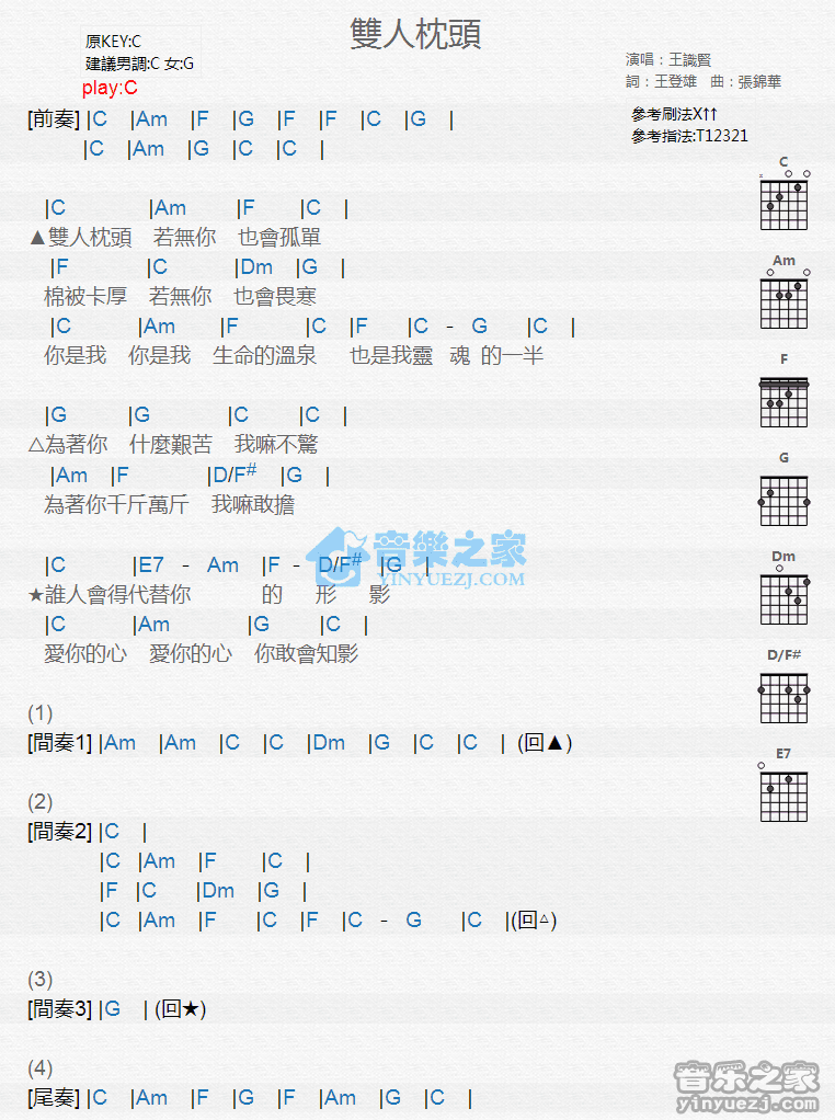 C调版王识贤《双人枕头》吉他和弦弹唱谱...
