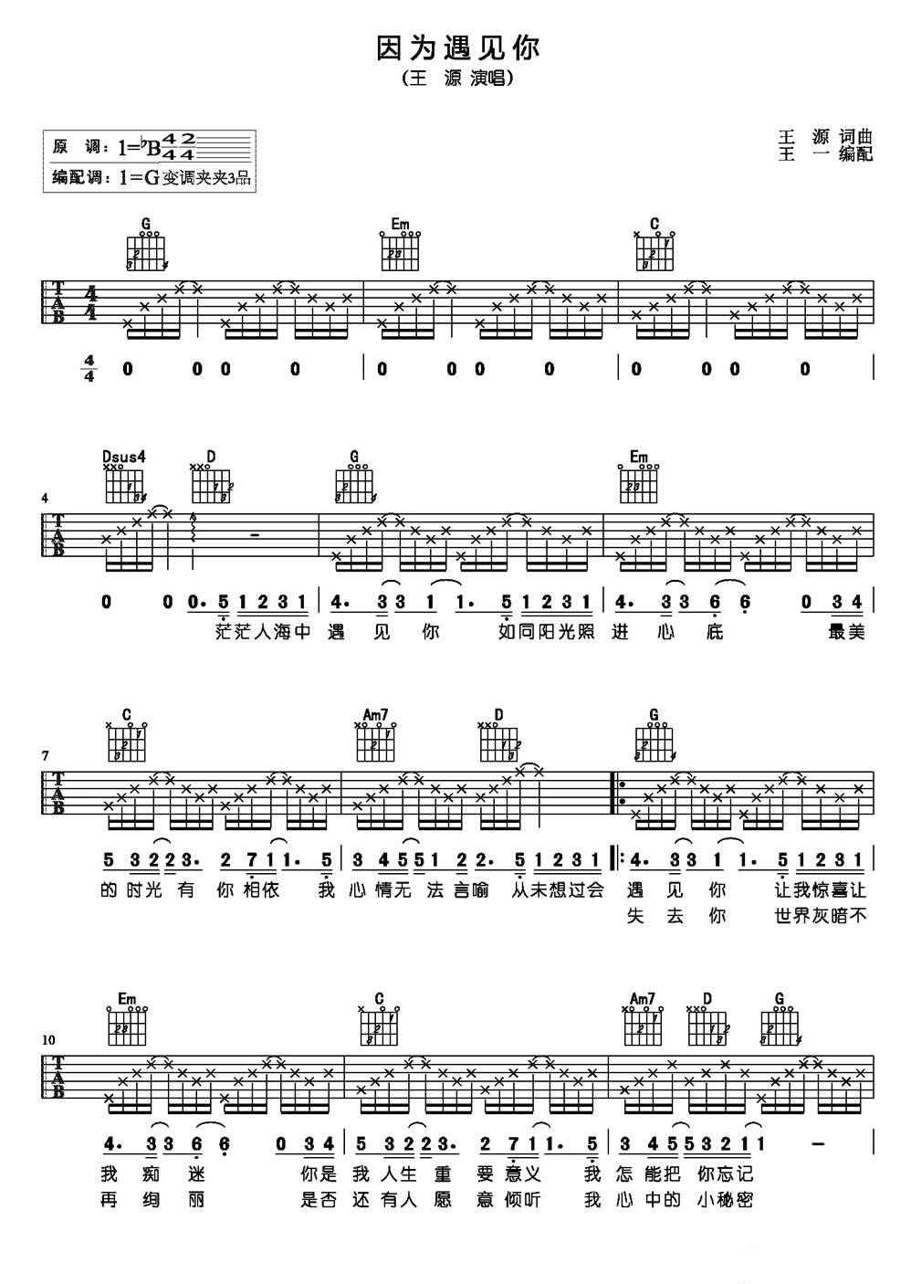 吉他王源《因为遇见你》吉他谱_吉他弹唱谱_王一编配