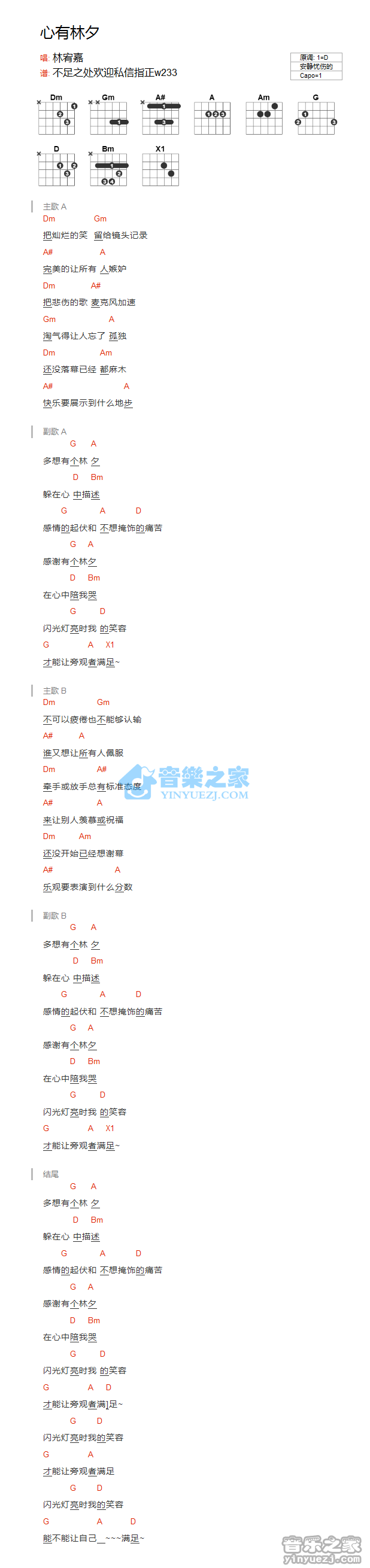 D调版林宥嘉/王源《心有林夕》吉他和弦弹唱谱...