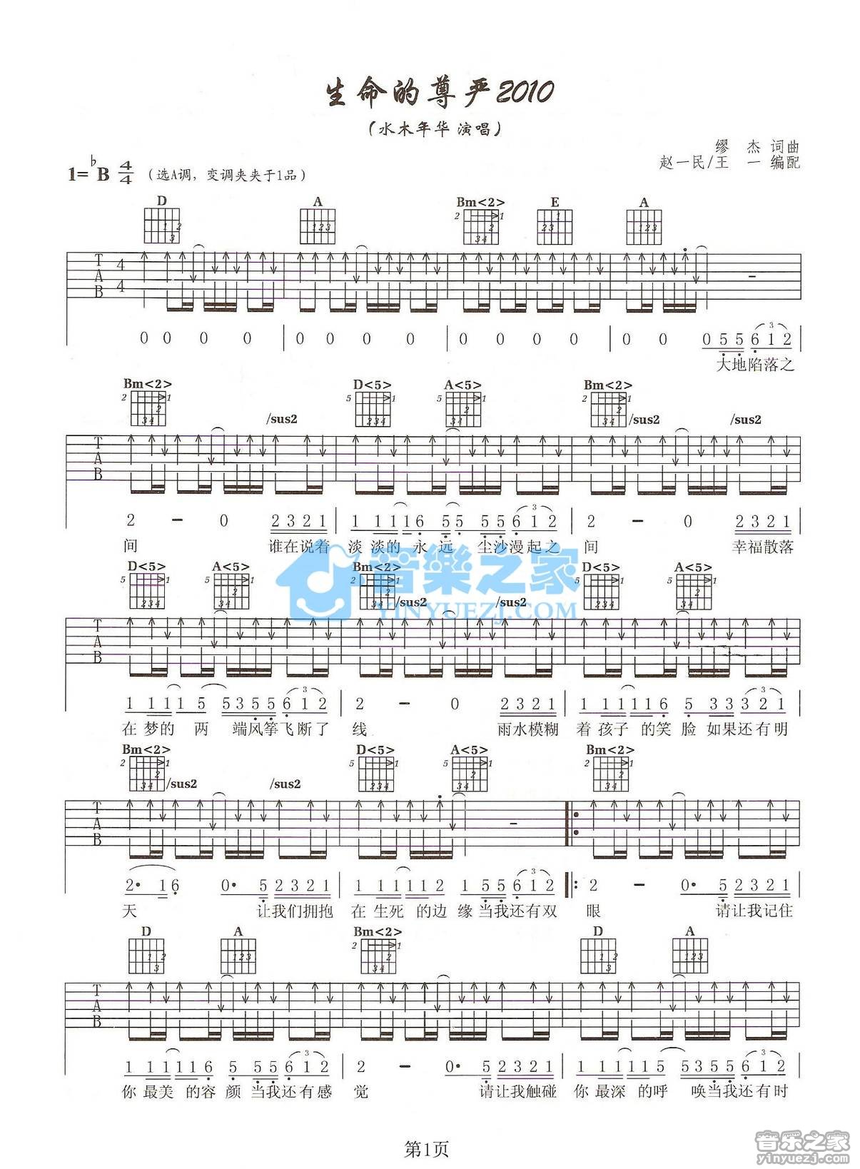 A调版水木年华《生命的尊严2010》吉他弹唱六线谱...