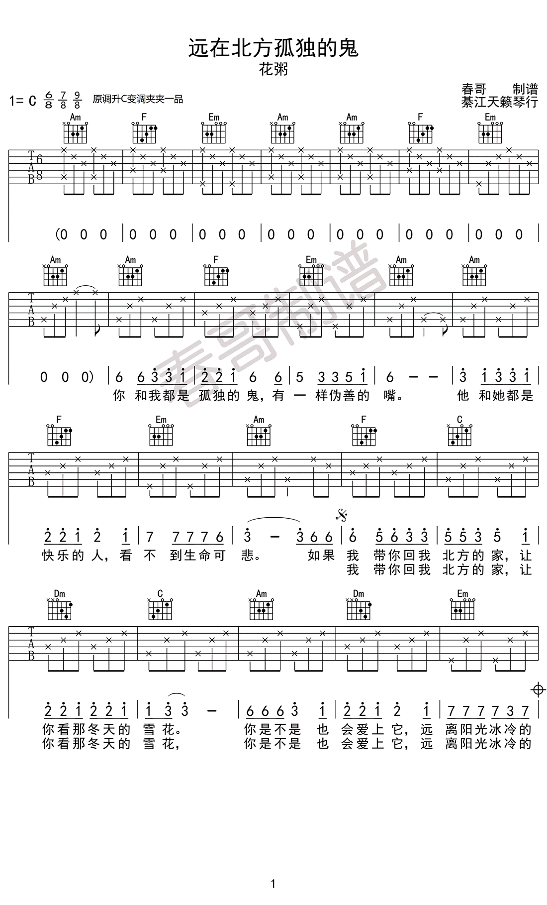 吉他花粥《远在北方孤独的鬼》吉他谱_吉他弹唱谱_春哥编配