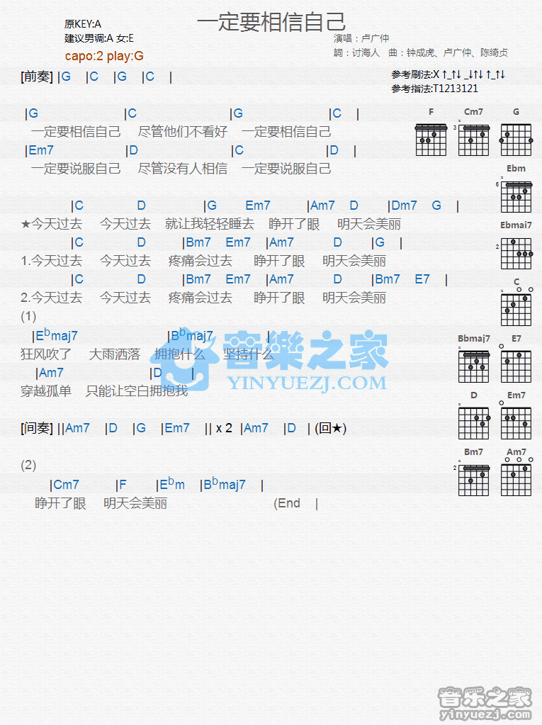 吉他卢广仲《一定要相信自己》吉他谱_吉他弹唱谱_YYZJ编配