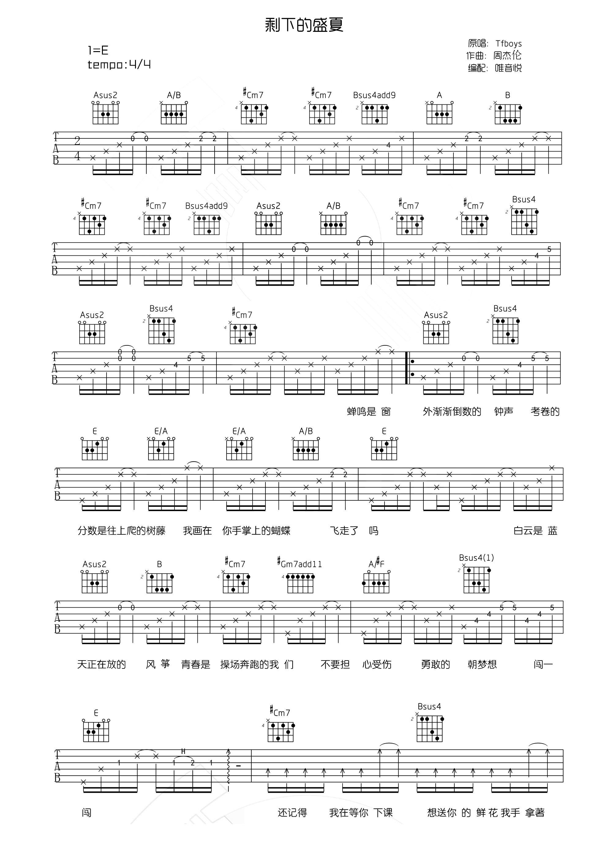 TFBOYS剩下的盛夏吉他谱,E调和弦编配,《剩下的盛夏》是周杰伦为人气少年组合TFBOYS写的一首关于校园的歌曲,青葱的操场,暖暖的阳光,树下的阴凉,三个小男孩唱出了成长的味道,也唱出了青春的味道。...