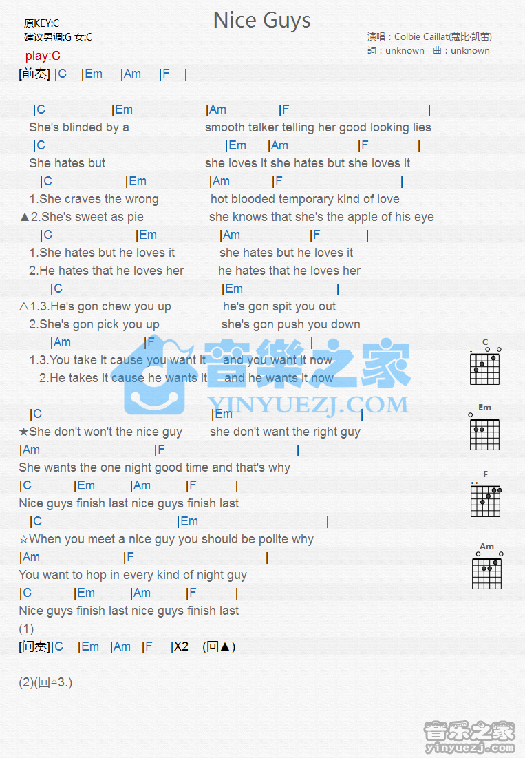 C调版ColbieCaillat《NiceGuys》吉他和弦弹唱谱...