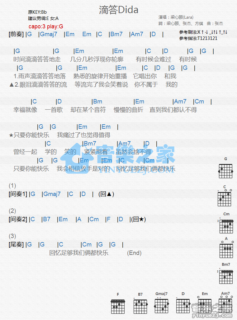 吉他梁心颐《滴答Dida》吉他谱_吉他弹唱谱_YYZJ编配