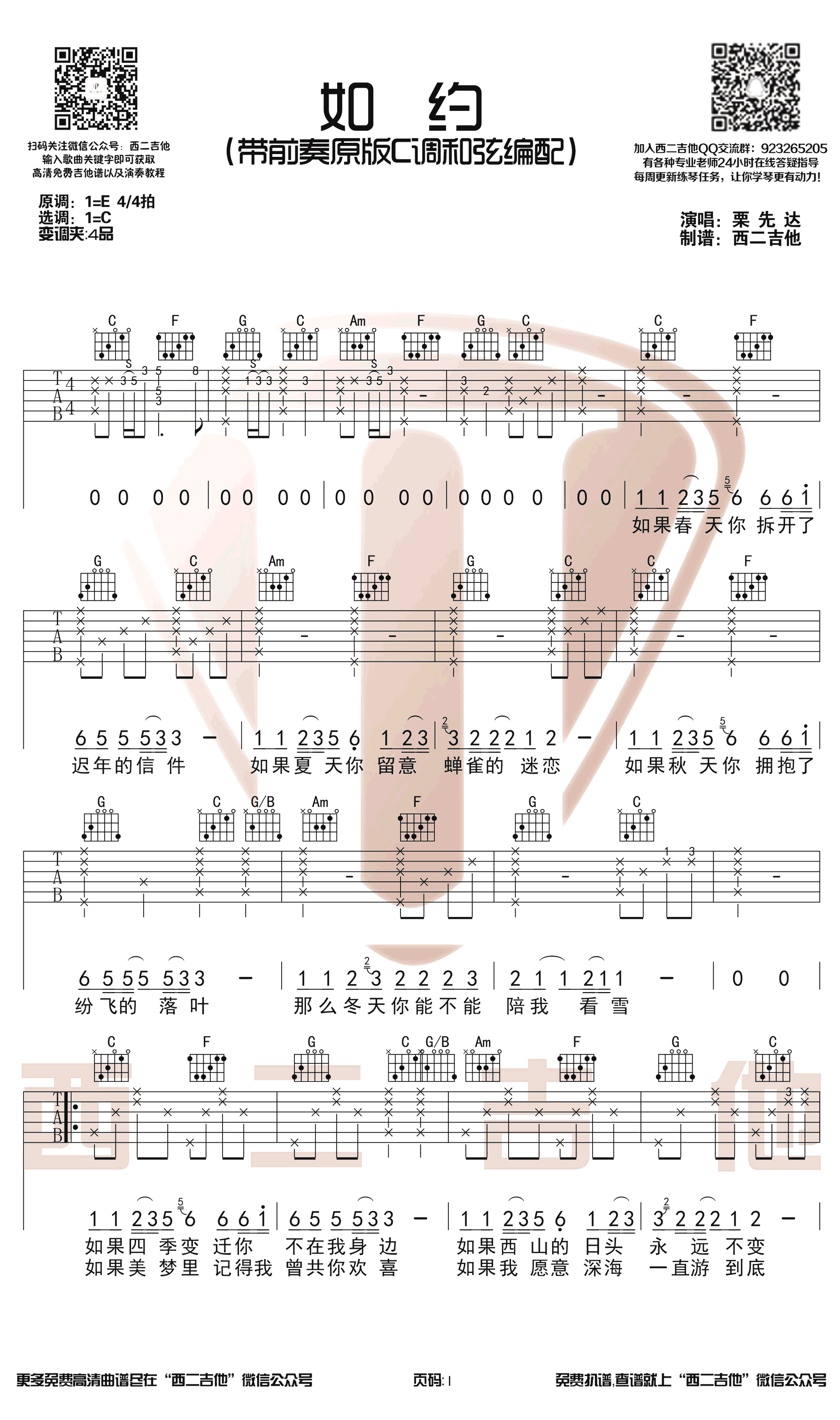 吉他栗先达《如约》吉他谱_吉他弹唱谱_西二吉他编配