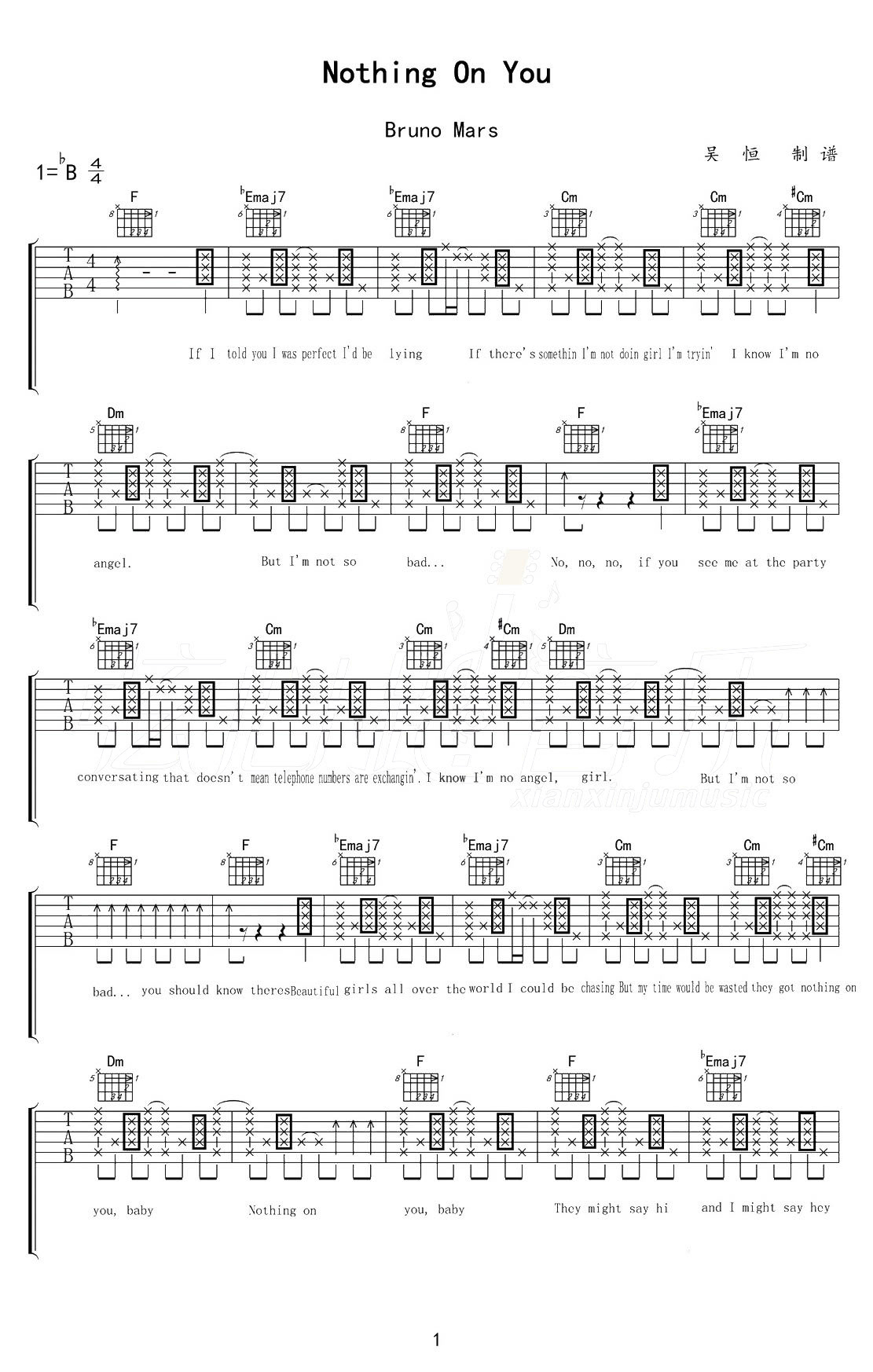 吉他Bruno Mars《nothing on you》吉他谱_吉他弹唱谱_弦心距--吴恒编配