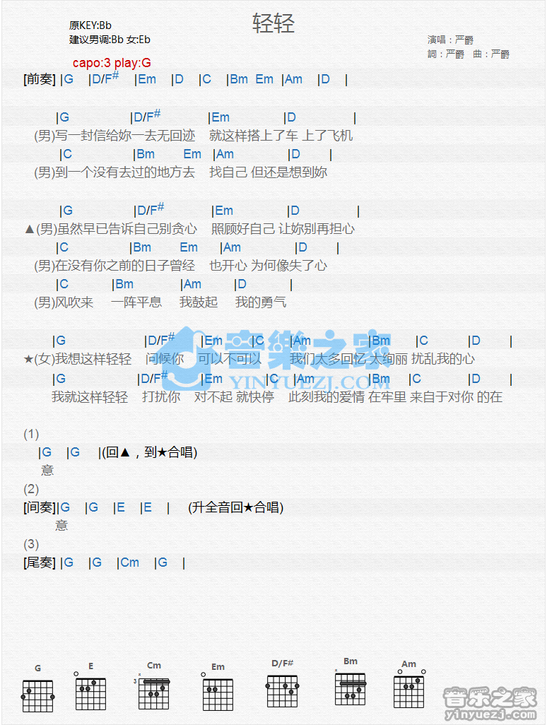 吉他严爵《轻轻》吉他谱_吉他弹唱谱_YYZJ编配
