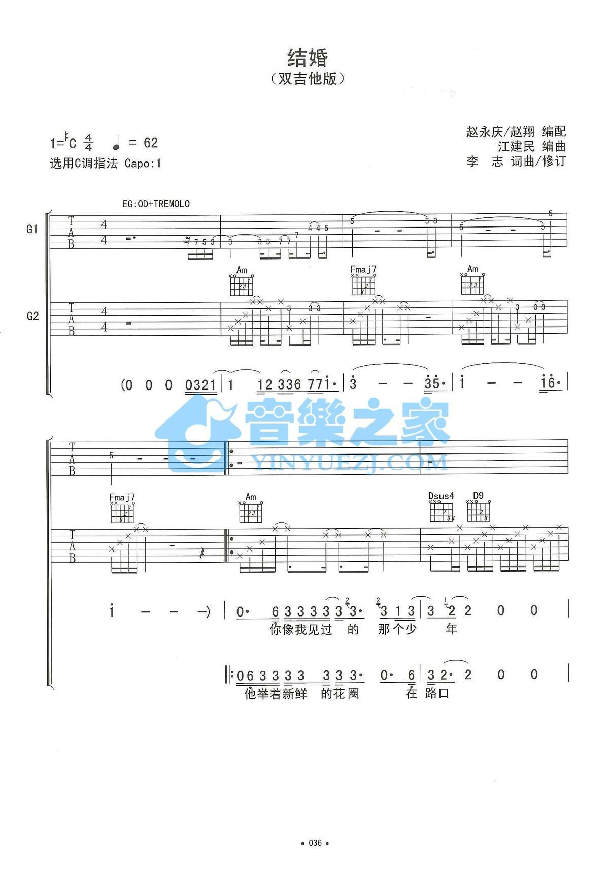 C调双吉他版李志《结婚》吉他弹唱六线谱...