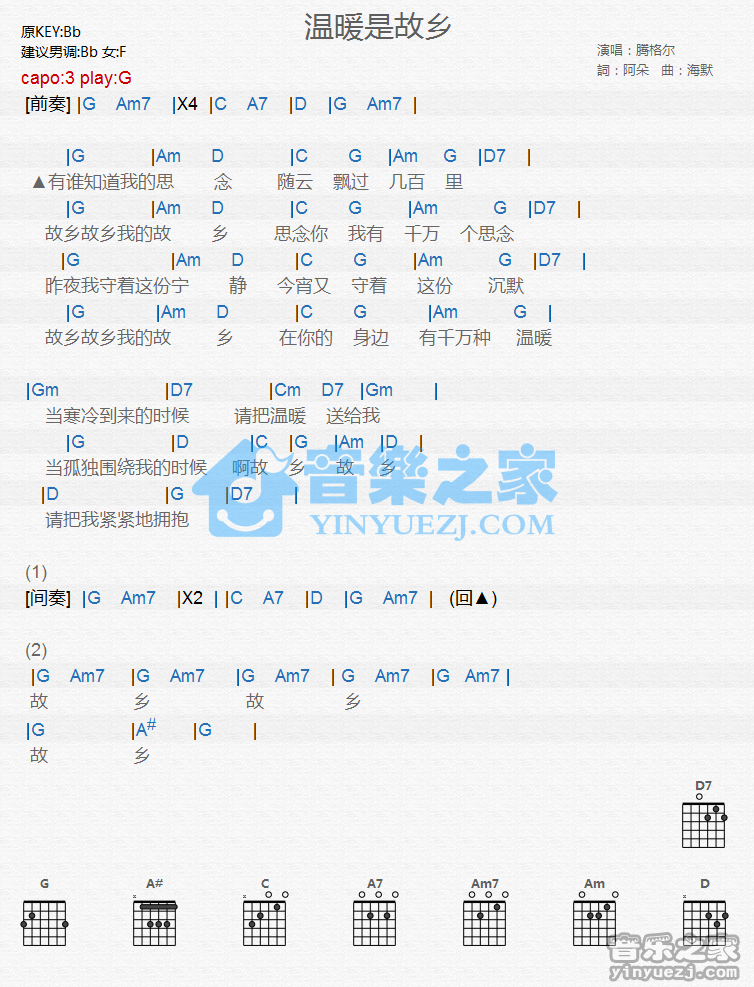 G调版腾格尔《温柔是故乡》吉他和弦弹唱谱...