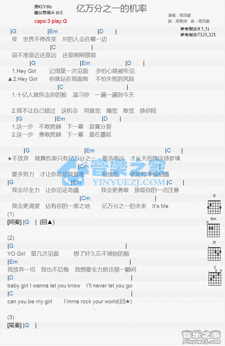 吉他周汤豪《亿万分之一的机率》吉他谱_吉他弹唱谱_YYZJ编配