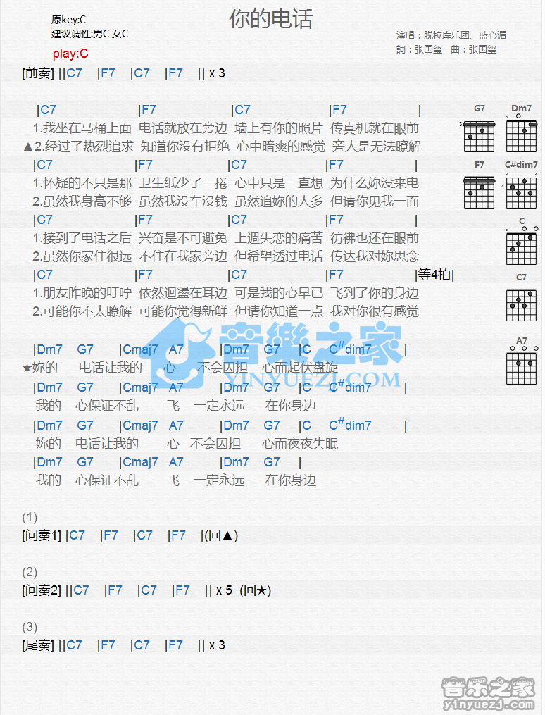 吉他脱拉库乐队《你的电话》吉他谱_吉他弹唱谱_YYZJ编配