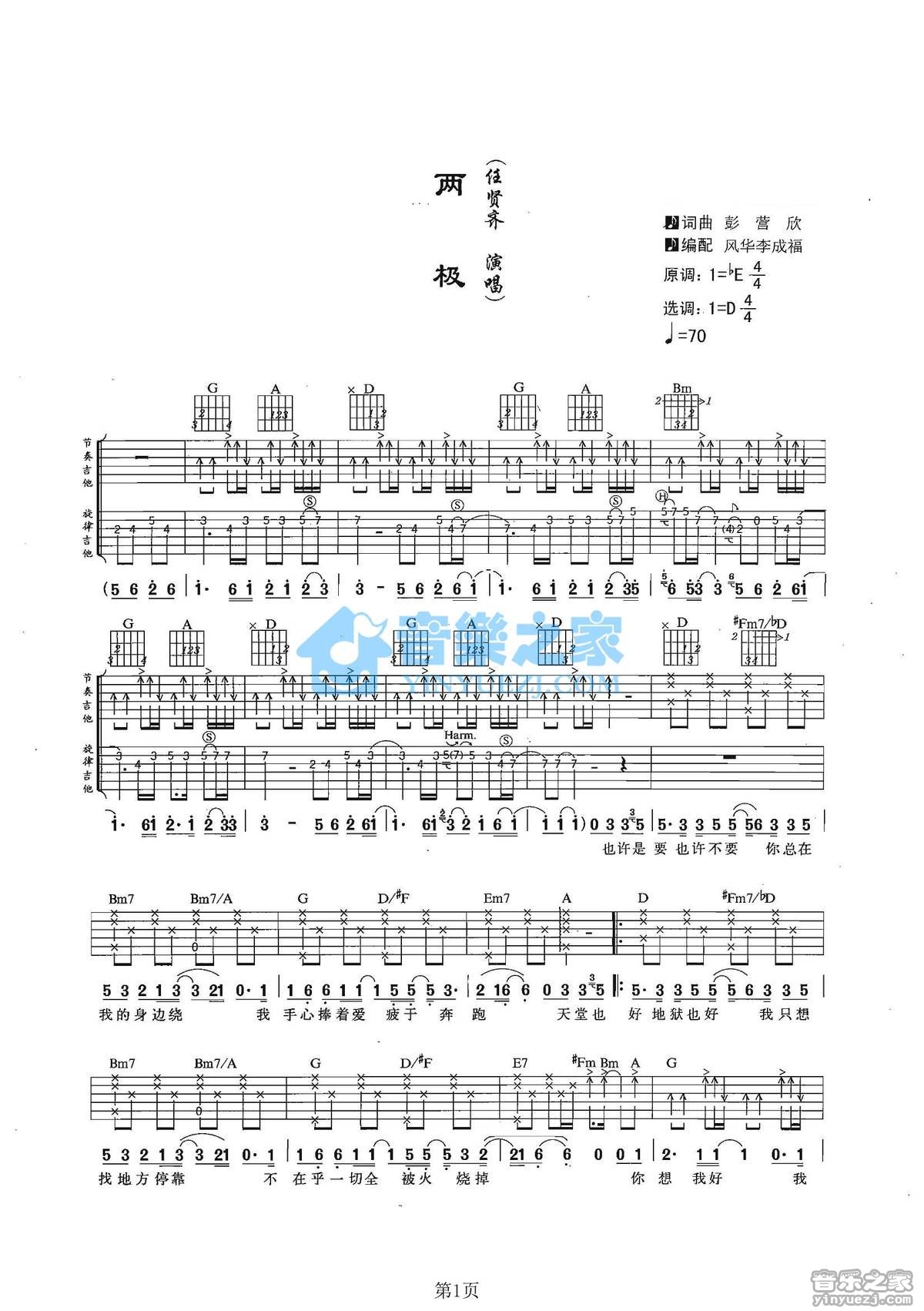 D调双吉他版任贤齐《两级》吉他弹唱六线谱...