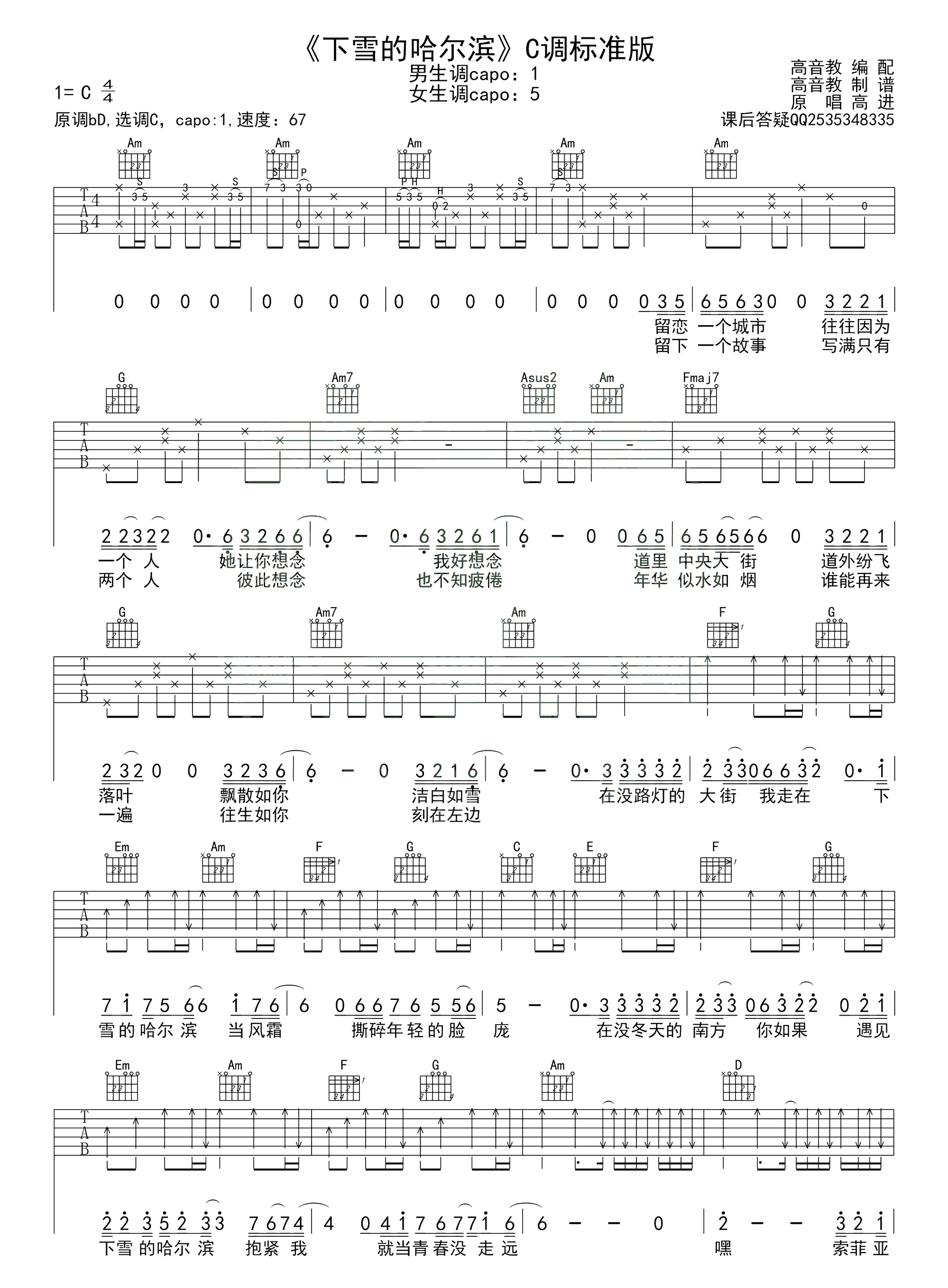 吉他高进《下雪的哈尔滨》吉他谱_吉他弹唱谱_高音教编配